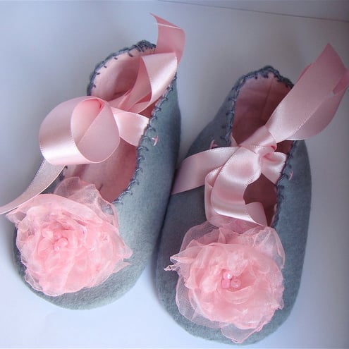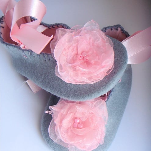 These are so cute, made from felt they have grey uppers and soles, and are lined in pale pink, they are decorated with 1 pale pink handmade organza flower on each shoe, with pink ribbon ties. the pattern for these shoes are for 3-6 mths, but they may fit an older baby, 11cm length and 5cm wide, inside measurements.