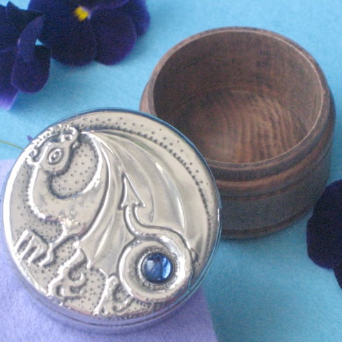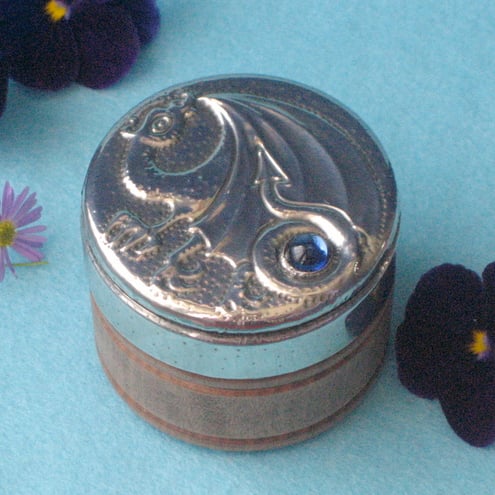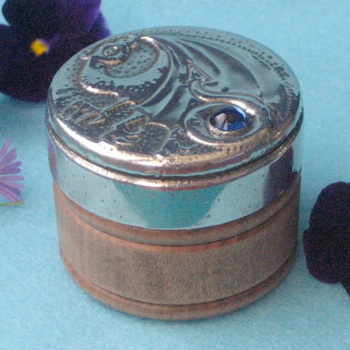 This small wooden box has been transformed with a lid of pewter,featuring a blue glass cabochon. It measures 44mm,1.75ins,in height and is 55mm,2.25ins, in diameter.The wood has been lightly tinted.