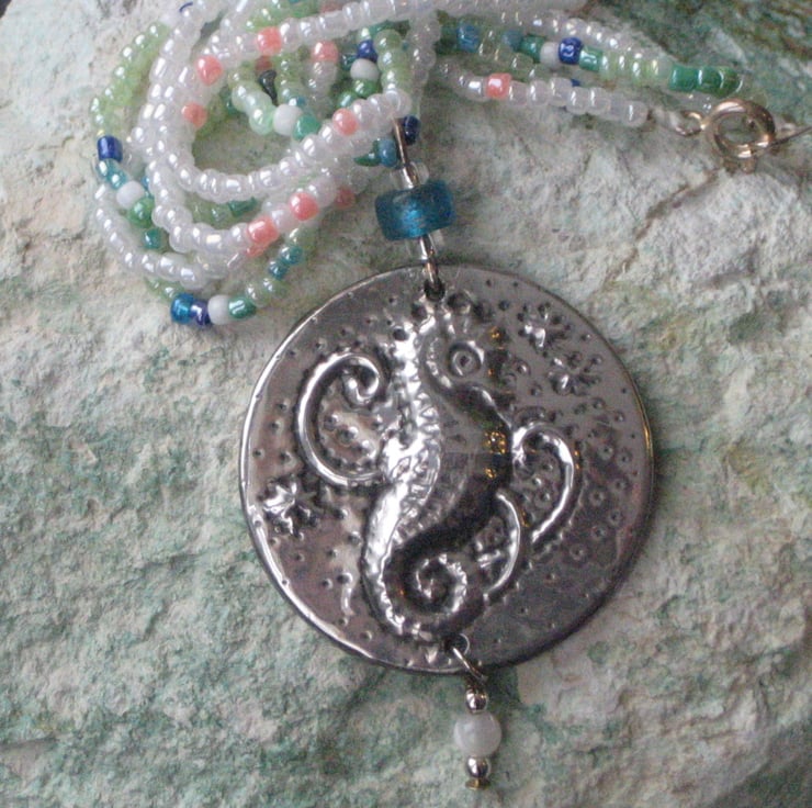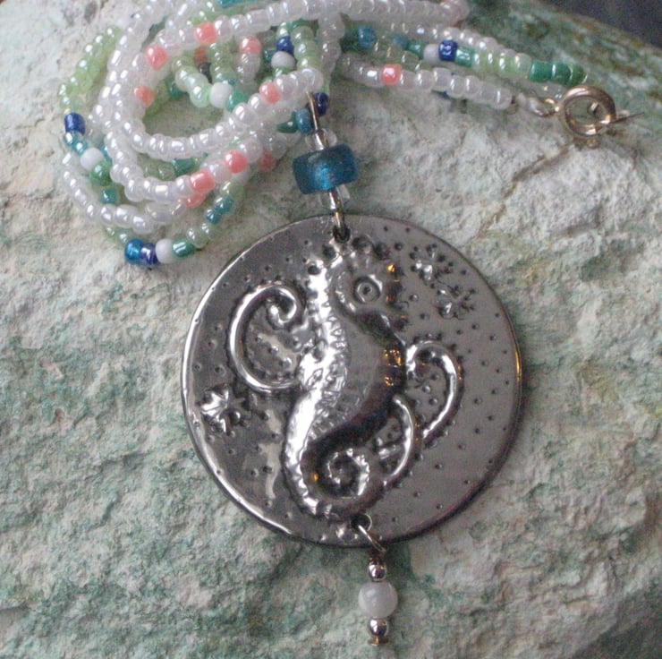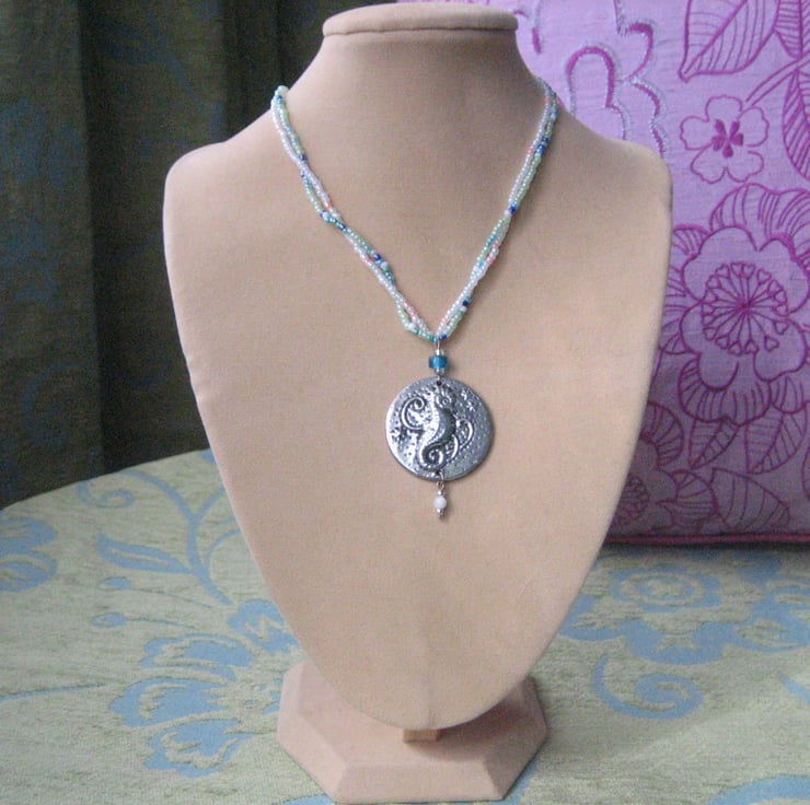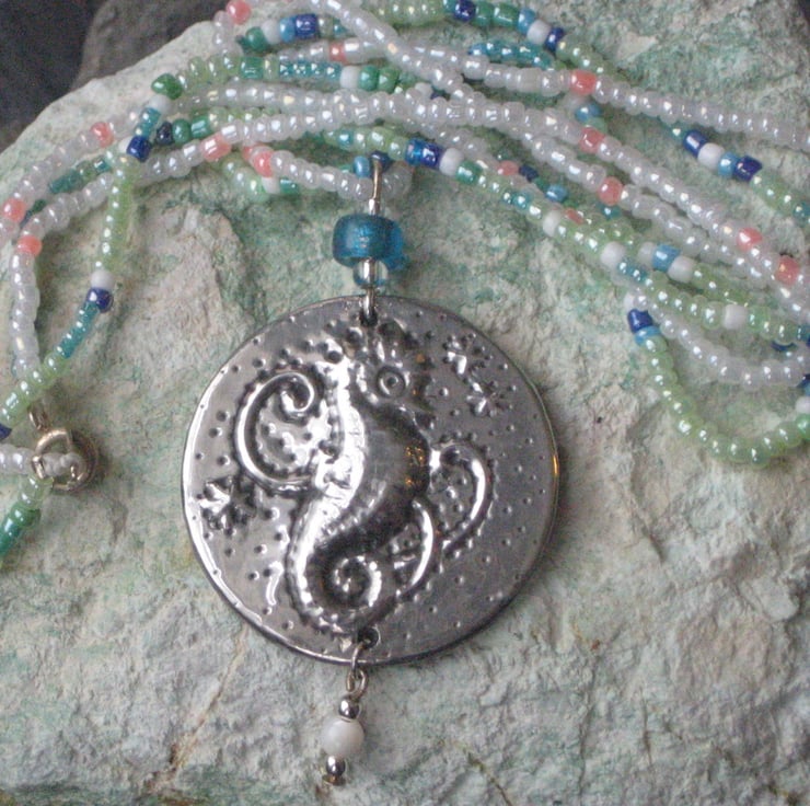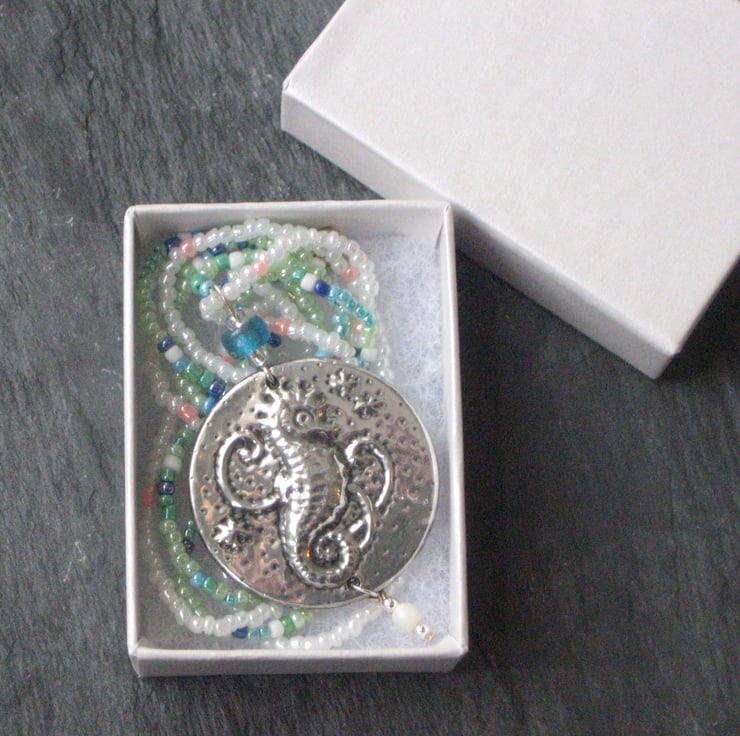Originally £10, now half-price. Silver pewter seahorse necklace. This pretty necklace is made from glass seed beads in blues, greens, pearl and coral, and features a handmade pewter pendant. A mother-of-pearl bead is suspended from the disc. The simple two-strand necklace can be worn straight or twisted, and is 43.5cm long(17'). The disc is 32mm(1.25) across. Gift boxed (may differ from that shown). A great gift for a 10th Wedding Anniversary, Mothers' Day, Valentine's Day or Birthday. Please note that the display model is not lifesize.