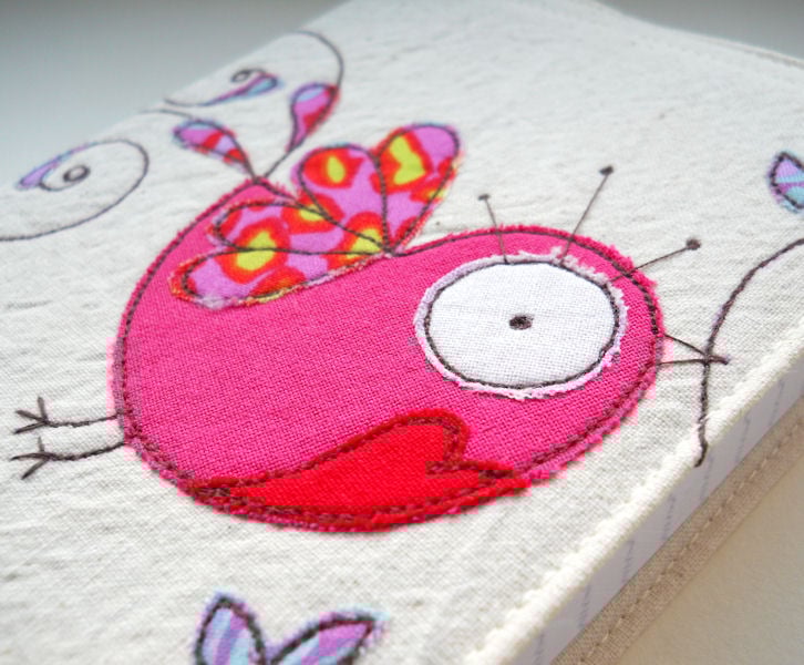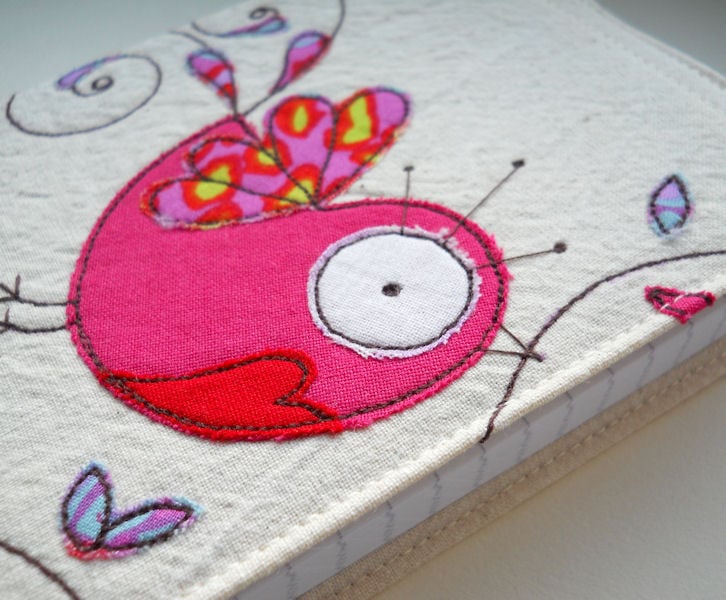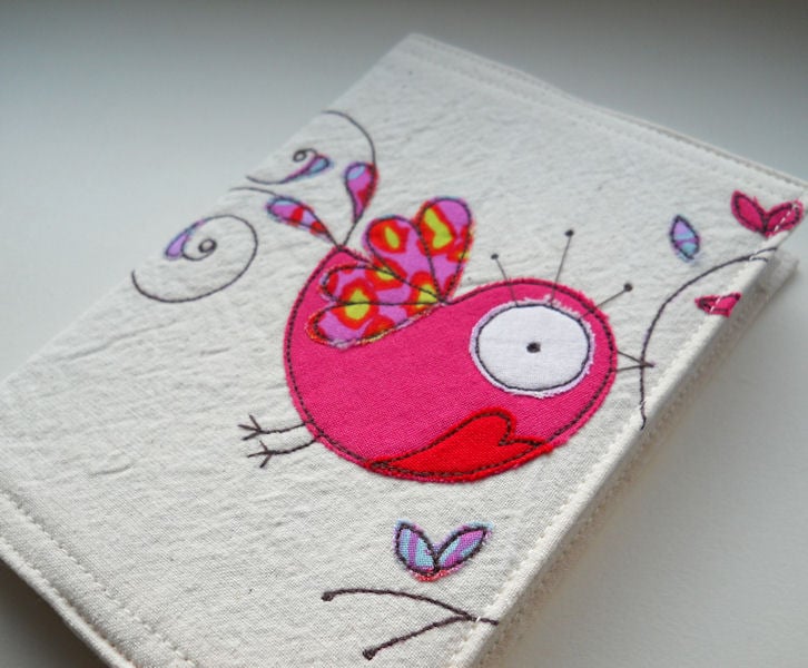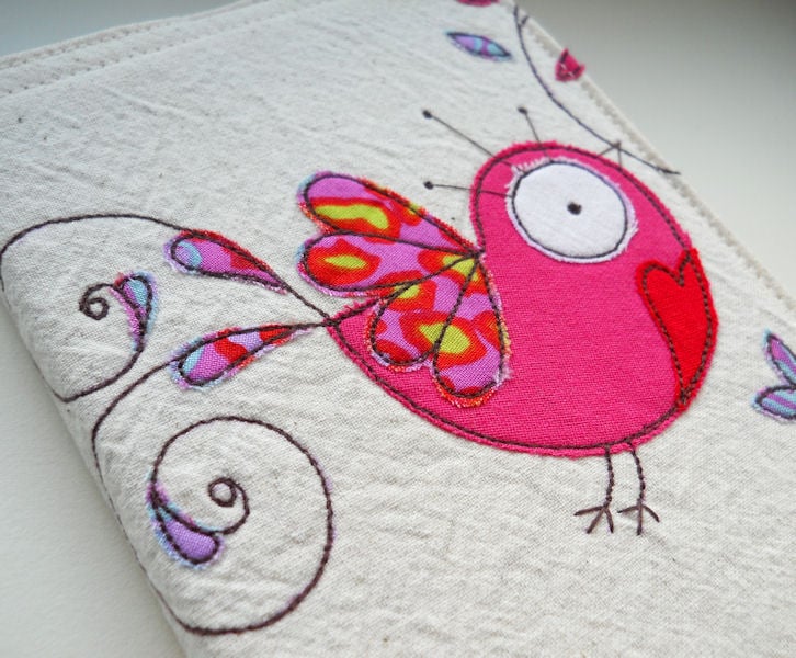 the bird is in pink fabric with a bright red heart on its chest, and bright printed cotton wing and tail feather details. branches and tiny leaves extend onto the inner cover flap.