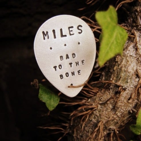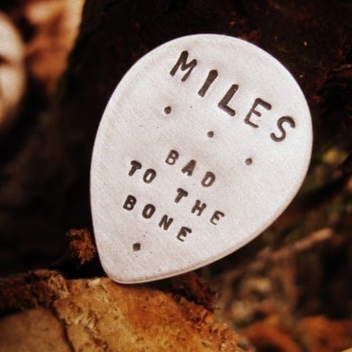 Sterling silver guitar plectrums, hand stamped letter-by-letter with you chosen words, names, lyrics or dates!