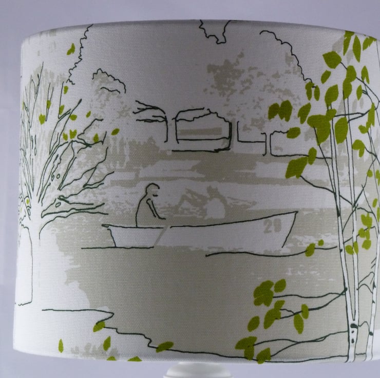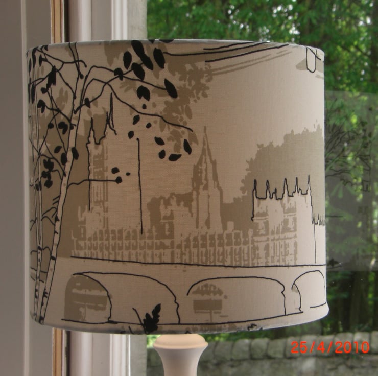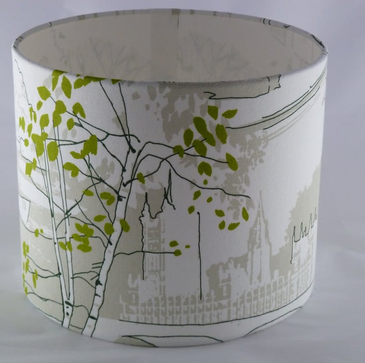 This lovely lampshade shows views of London - Big Ben, the Houses of Parliament, silver birch tree with green leaves and a boat on the Thames.