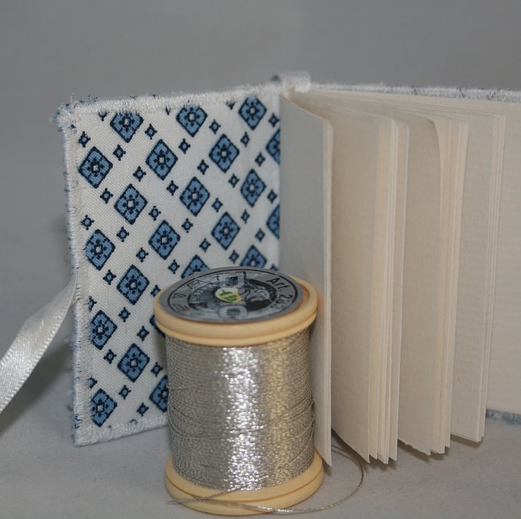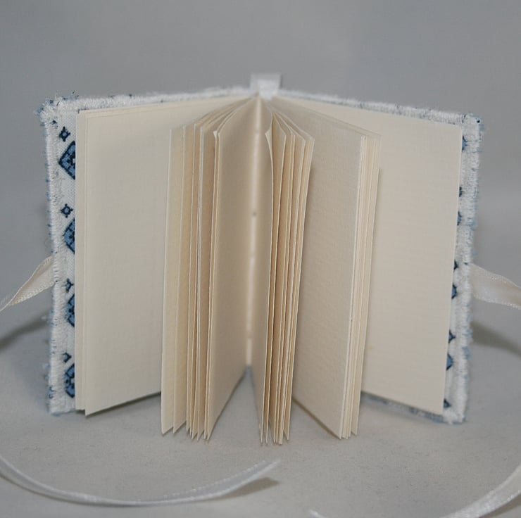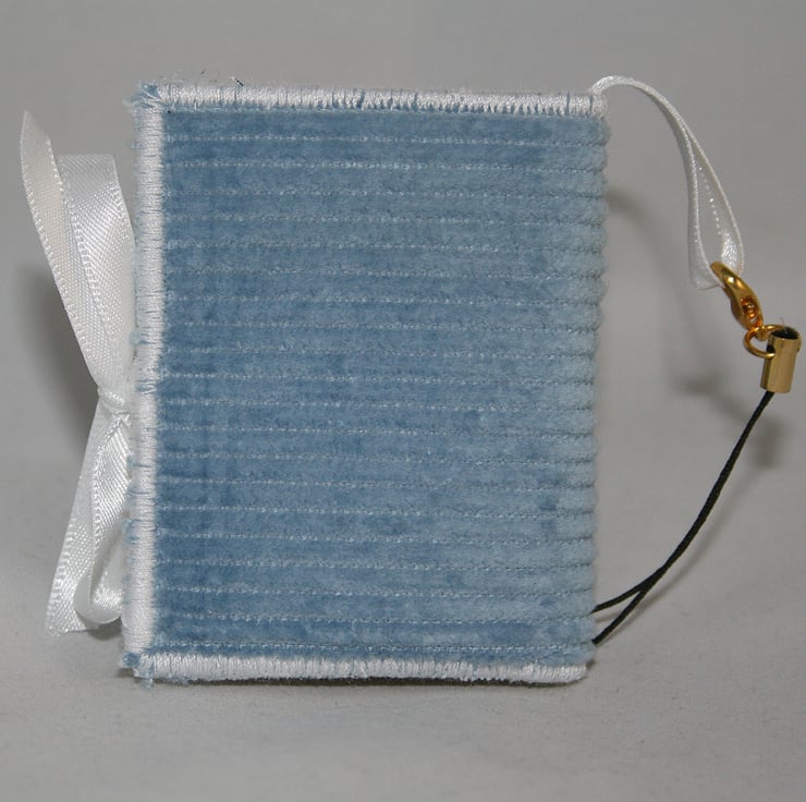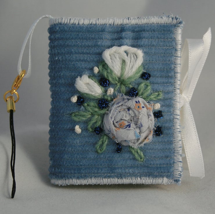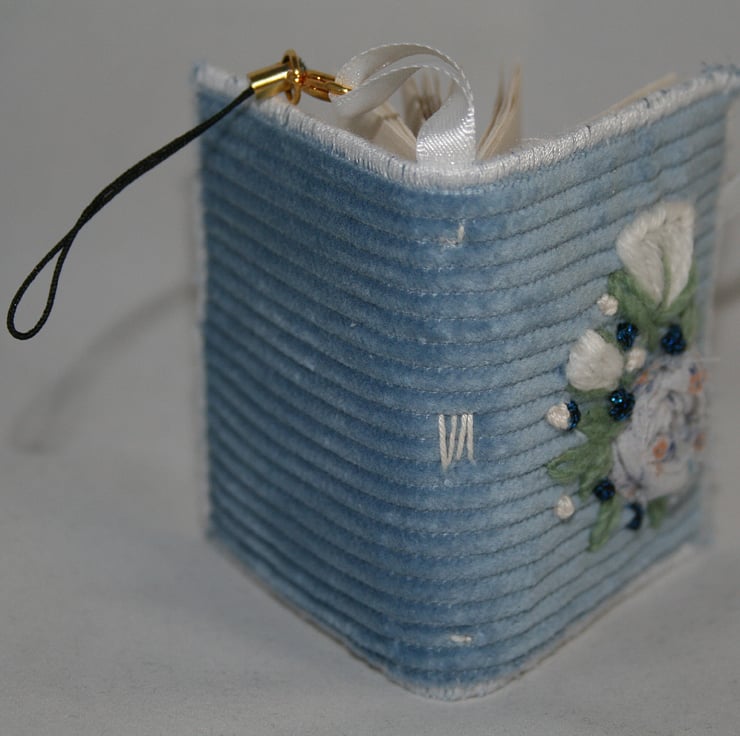 A posy of embroidered roses decorates the outer cover of this miniature, hand made book. Attached to a charm cord it could be used for addresses, phone numbers, birthdays or give as a gift and write a secret message inside!