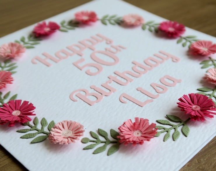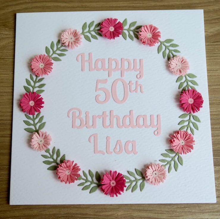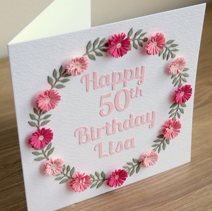 Square white textured background card featuring a personalised message, surrounded by a circular garland of quilled daisies in pretty colours with green foliage. You choose the wording for the message. This can include a name and an age of your choice. Just leave me a note of your personalisation details when you order.