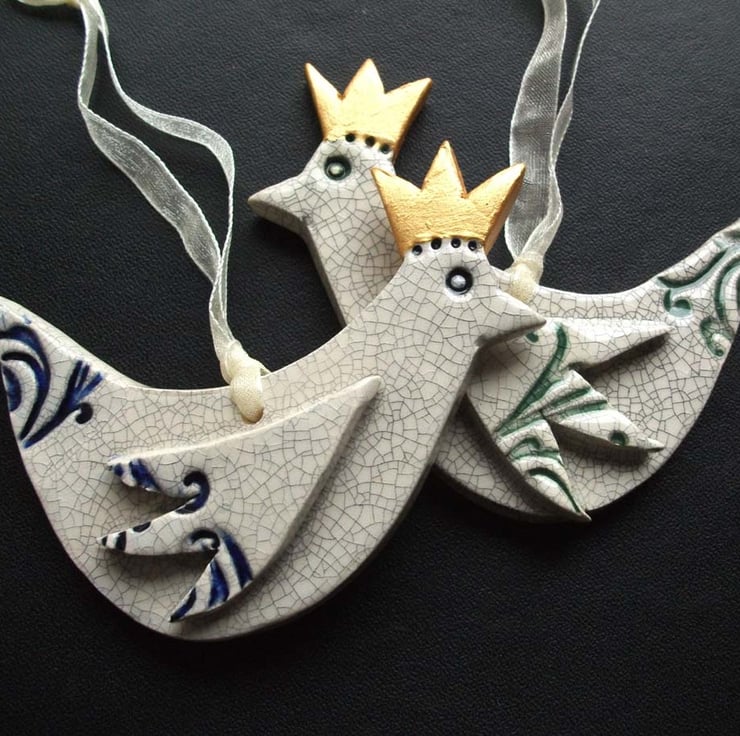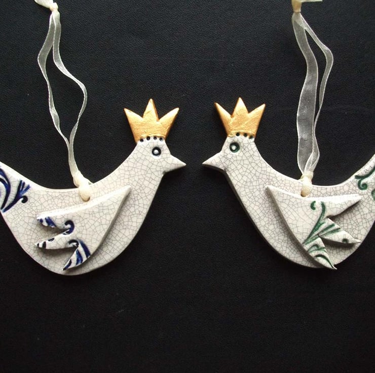 This set of two cute little birds with their golden Xmas hats on are made from white earthenware clay.