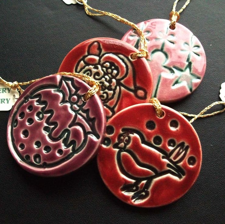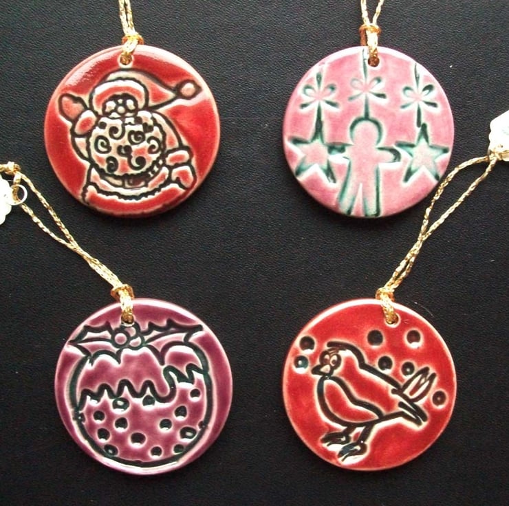 This set of four brightly coloured Christmas decorations are hand stamped (with commercially available images) onto white earthenware and then cut out.
