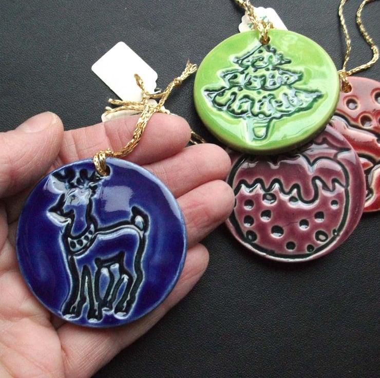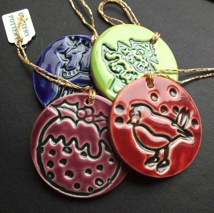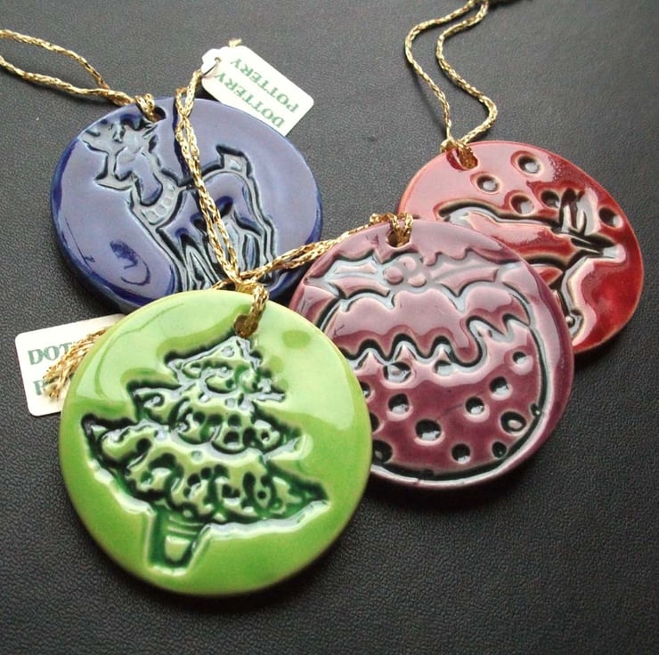 This set of four brightly coloured Christmas decorations are hand stamped (with commercially available images) onto white earthenware and then cut out.
