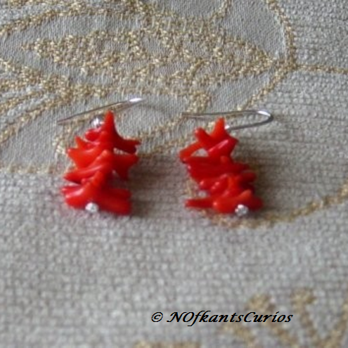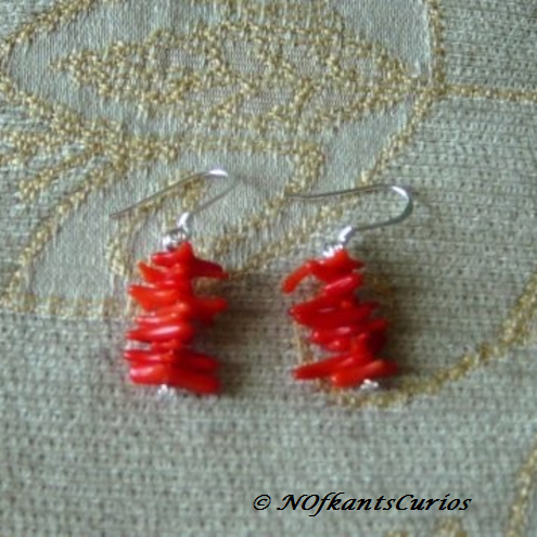 The earrings have 925 marked sterling silver French hooks findings and the post onto which the red coral branch fragments have been threaded, is also sterling silver.