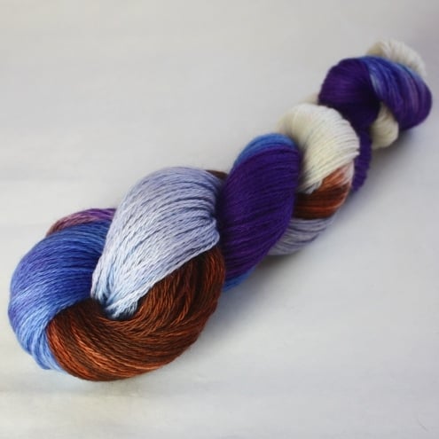 Chocolate cake smears all over a pretty party dress... This yarn has purple, blue, ice blue and cocoa with sections left undyed. This soft and squishy yarn should make wonderful socks, or other projects requiring sock-weight yarn. The yarn has been reskeined as shown in the first two photographs, but is shown in the third photo before reskeining, for reference only. This yarn is likely to form a repeating pattern as it is worked.