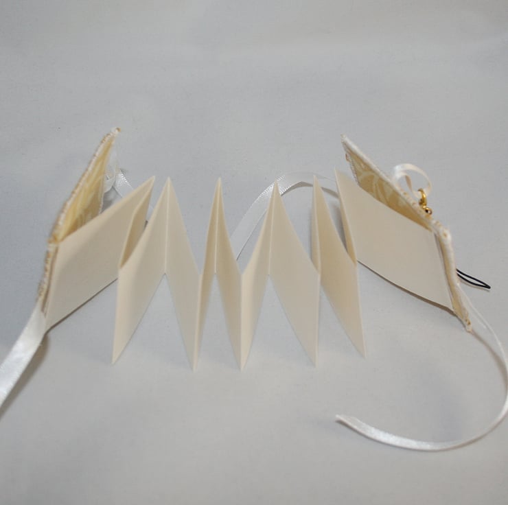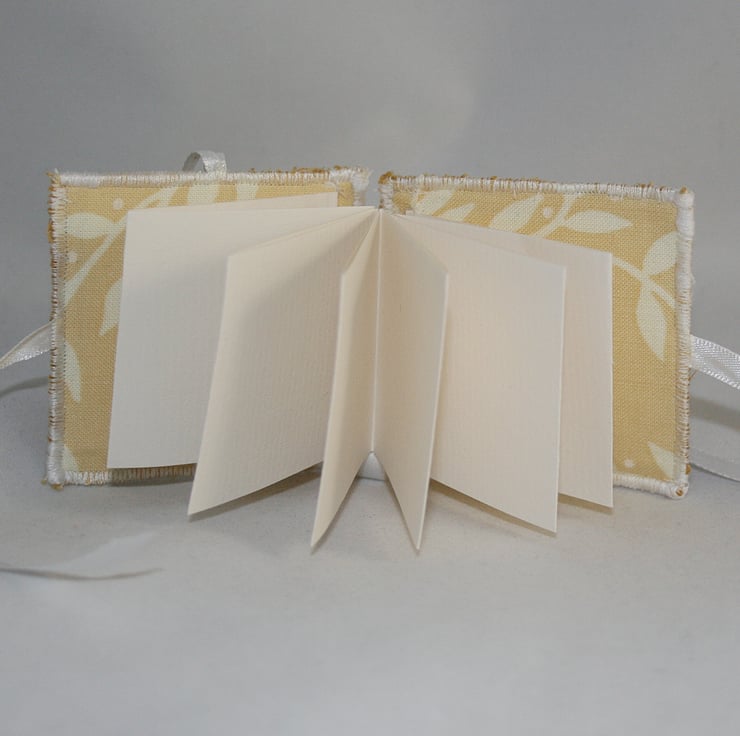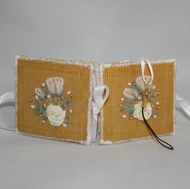 The cover is cut from needle cord fabric in an antique gold colour. The embroidery has been worked in tapestry wools and metallic blue thread. The full blown rose has been stitched in silk ribbon using ribbon embroidery techniques. The cover is lined with a cream patterned fabric. The lining is backed with iron-on interfacing. The cover is reinforced with heavy interfacing. The cover ties closed at each side with a ribbon bow. A ribbon loop, at the top of the book, allows the charm cord to be attached. This book is in a 'zig-zag' (concertina) format. Opened one side access is gained to one side of the page 'strip', open the other side for access to the reverse - or both at once to loosen the zig-zag completely.