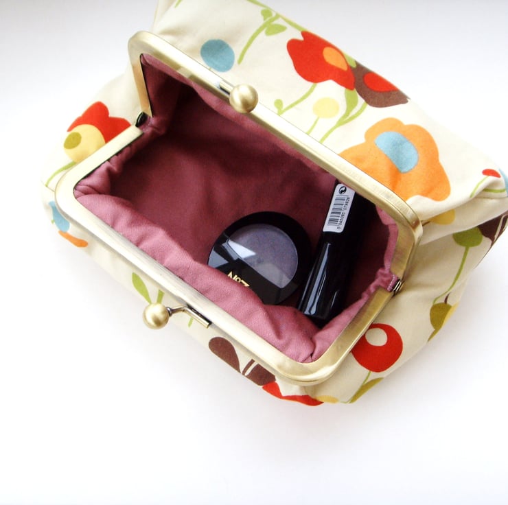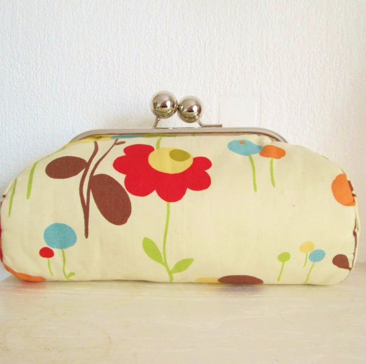 Perfect little clutch for your mobile phone, keys, sunglasses,change and credit cards or even a make-up bag. Pretty Moda Wonderland fabric with contrasting mustard colour lining, padding and metal frame clasp.