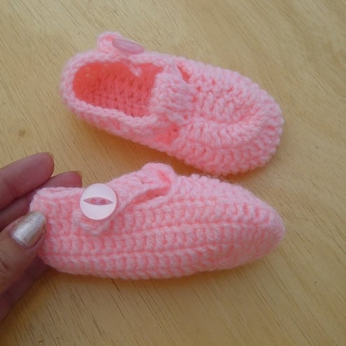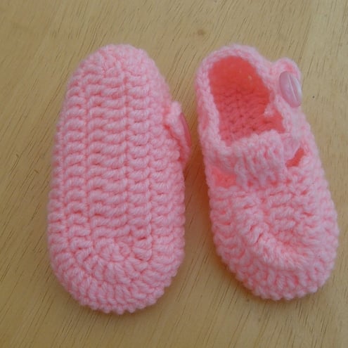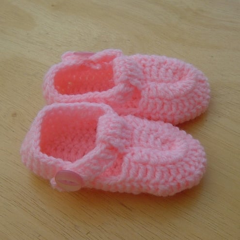 Bright Pink, hand crocheted baby girls shoes, with single button strap.