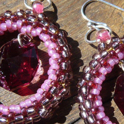 These earrings are made of seed beads with a 1.5cm big Swarovski crystal in the centre of the beaded stucture.