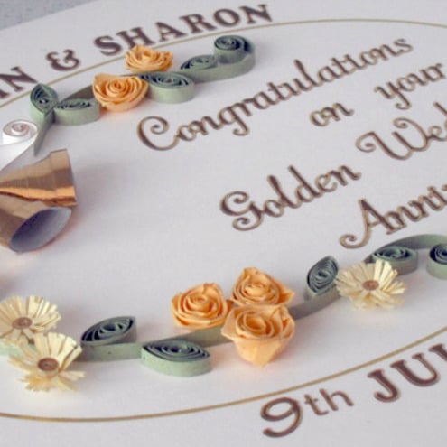 A handmade quilled personalised 50th golden wedding anniversary card with quilling bells and roses.