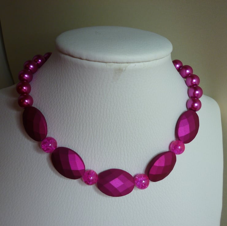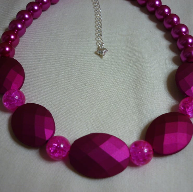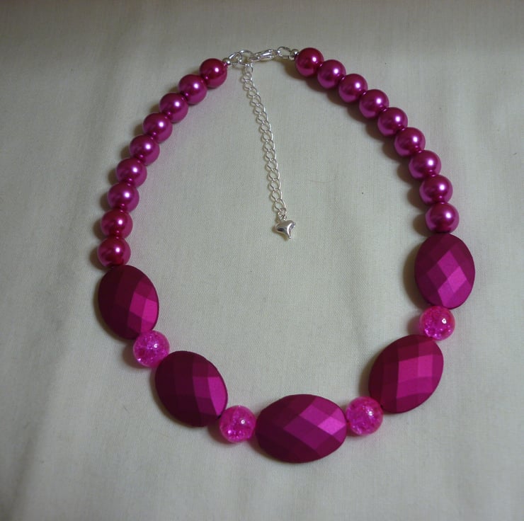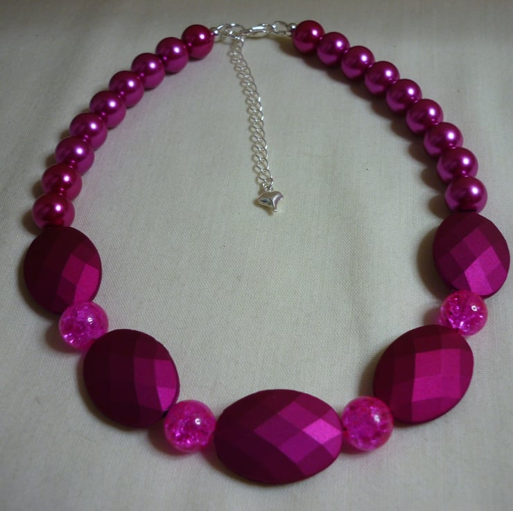 THE NECKLACE IS MADE WITH CHUNKY SATIN MATT BEADS IN FUCHSIA ALONG WITH CRACKLE GLASS ROUND BEADS IN FUCHSIA AND SHINNY GLASS 10MM PEARLS IN FUCHSIA PINK, AND FINISHED WITH SILVER PLATED LOBSTER CLASP, FINDINGS AND SILVER PLATED EXTENSION CHAIN.