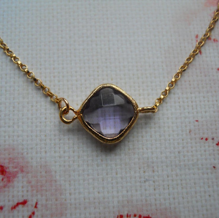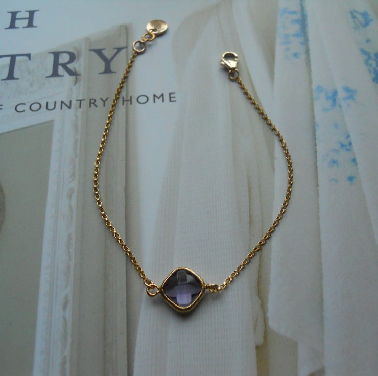 Goergous 14k gold filled bracelet with glass amathysy gold framed stone in the style of Monica Vinader.