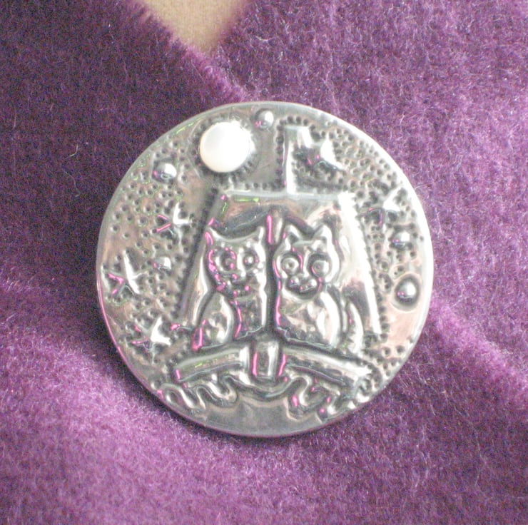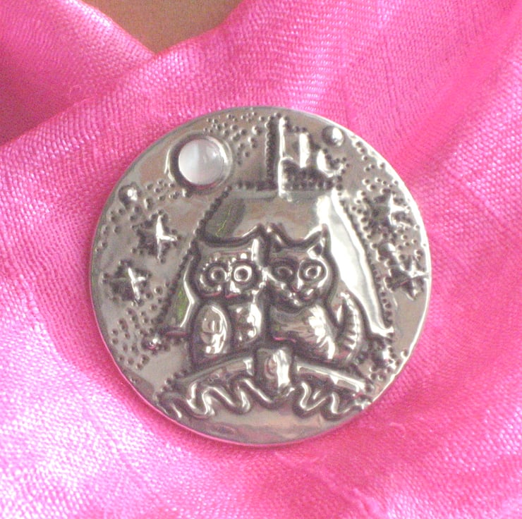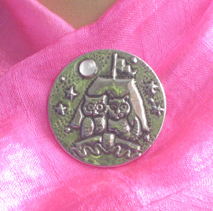 This brooch has been handmade in shiny lead-free pewter and features a genuine moonstone moon. It measures 45mm,1.75 in diameter and has a 30mm pin with safety catch on the reverse. In spite of its size, it is very light in weight. Gift boxed.
