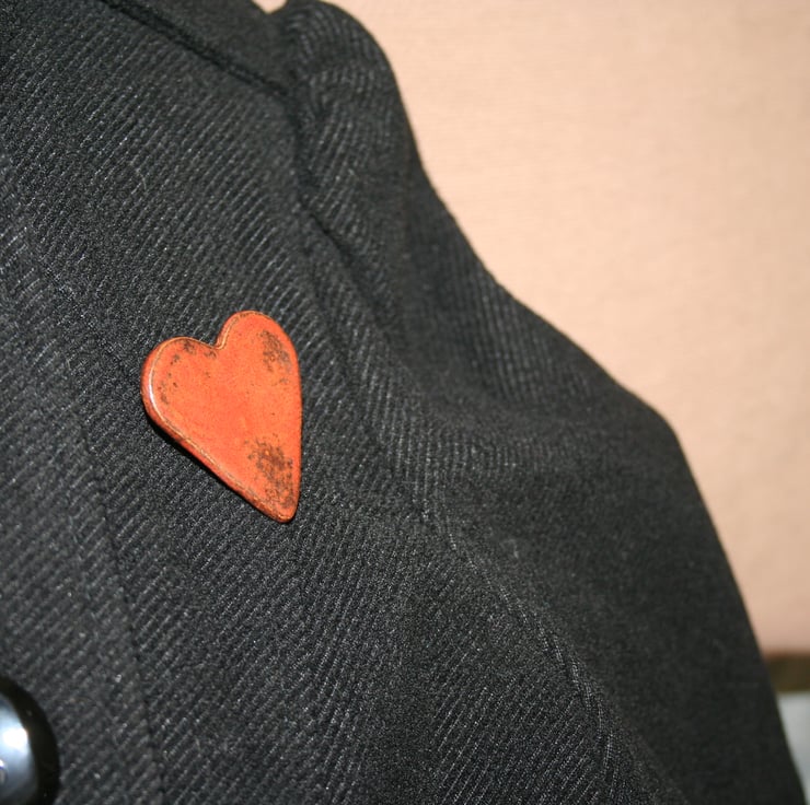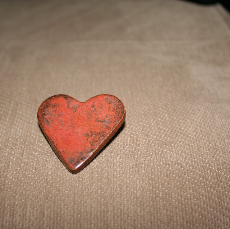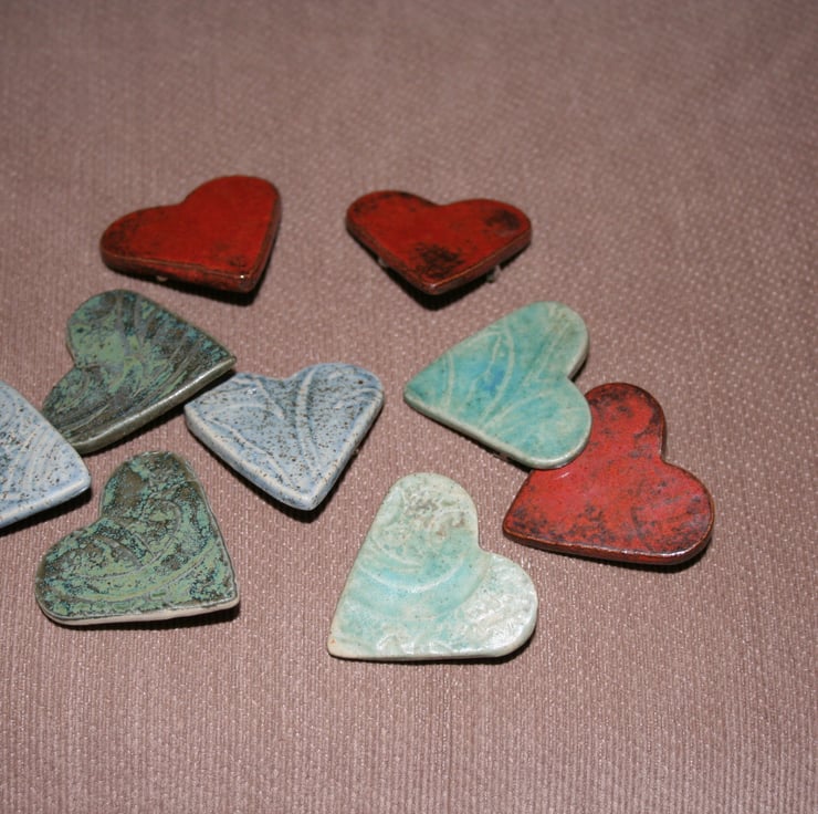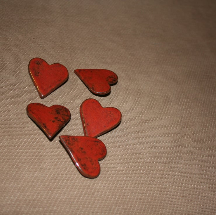 CUSTOMER ORDER FOR JUSTJES, handmade small heart brooches (x5) made from stoneware clay fired & then finished in red shiney metalic glaze with small brooch pin on back. Size is approx 5cm x 5cm.