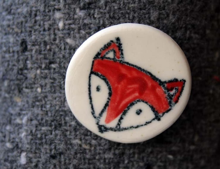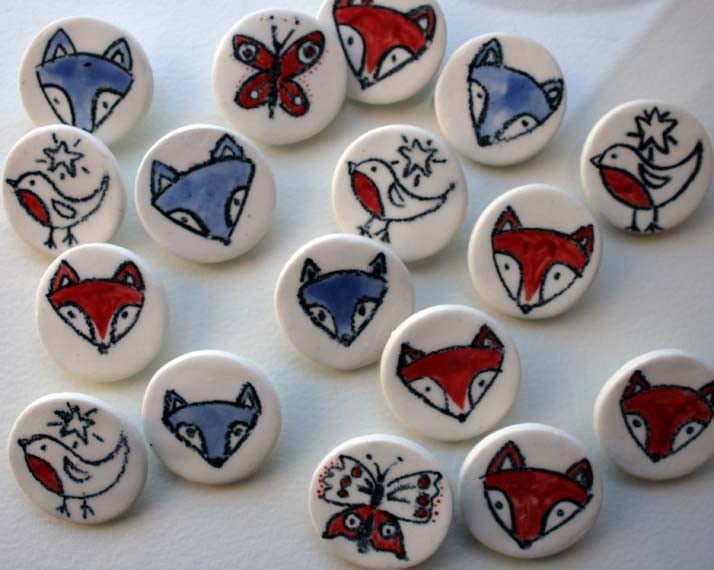Porcelain brooches -ready to ship -red fox, robin and star, blue wolf, butterfly