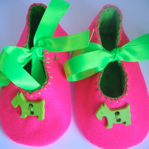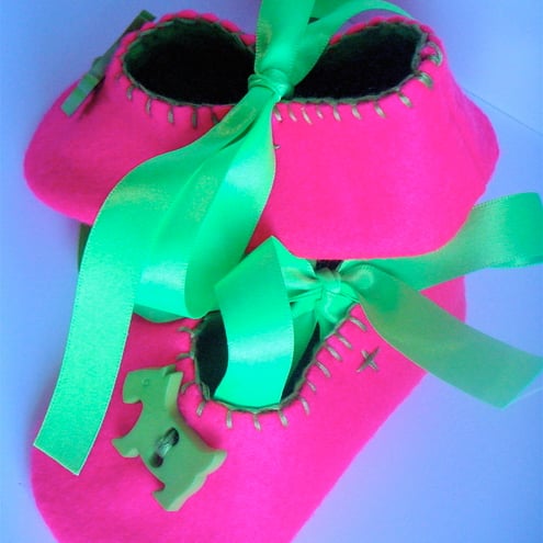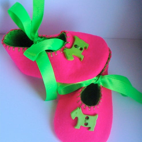 These are so sweet, made from felt they have Fuschia Pink uppers and soles, and are lined in lime green, they are decorated with 1 lime green Scottie dog button on each shoe, with lime green ribbon ties. the pattern for these shoes are for 3-6 mths, but they may fit an older baby, 11.5cm length and 5.5cm wide, inside measurements.