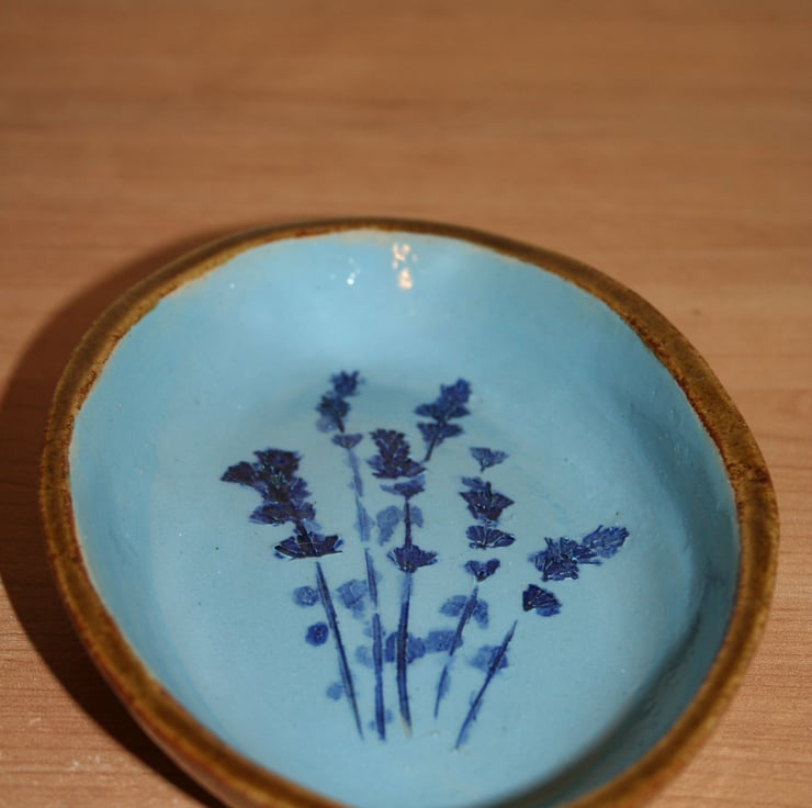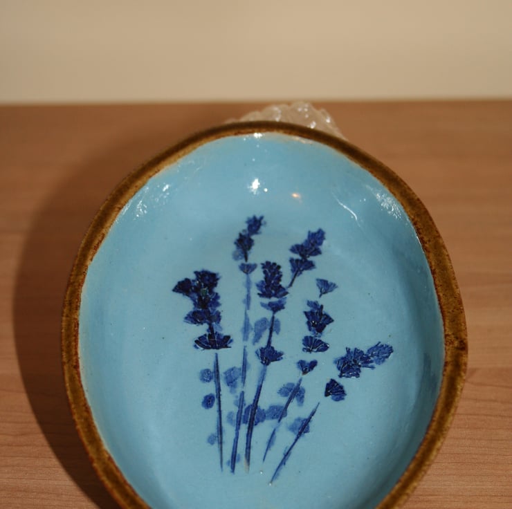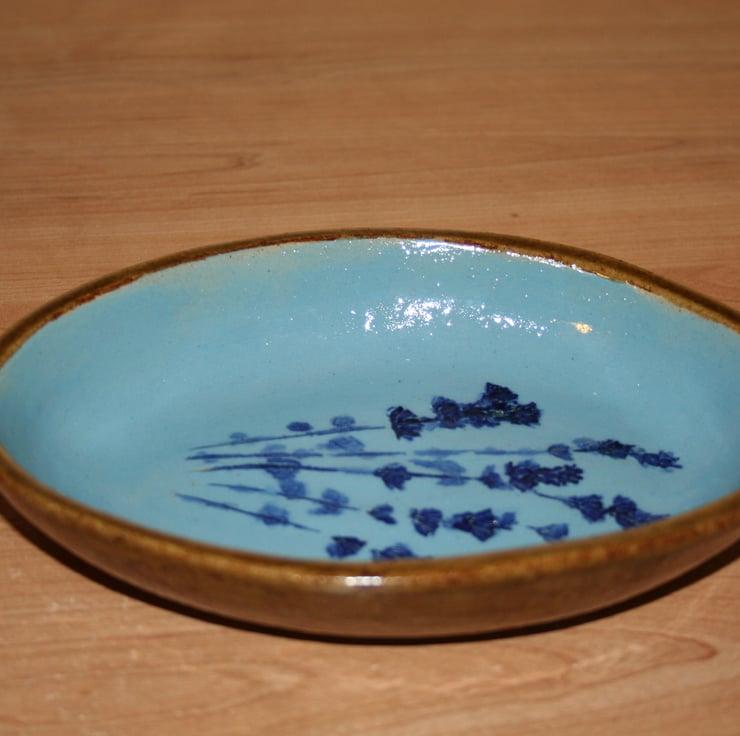 SALE was £18 now £10, Handmade stoneware clay oval shaped dishl with simple lavender impressed design, with blue slip decoration as base colour & lavender design finished with blue oxide & oatmeal colour glaze on edge & outer of bowl. (dish not glazed on bottom).