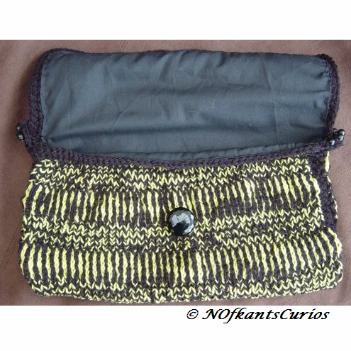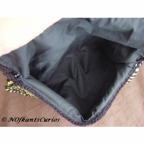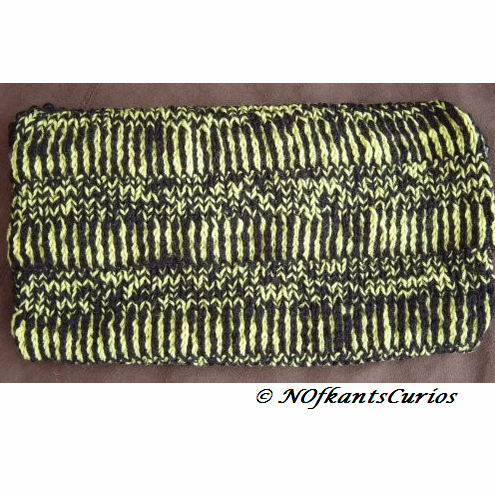 This is a handmade handbag, with two differing coloured yarns, one 100% Acrylic black yarn & one vibrant yellow 100% Polyester yarn & has been both knitted & crocheted. The main body of the handbag has been knitted with both yarns together to form a mottled effect & then seperately to give a striped effect, similar to a bumble bee.
