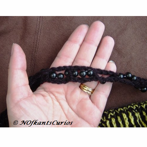 The handle strap has been made with both a section of vintage lucite bead necklace, securely sewn into place, but also crocheted on either side of the beads & secured approx every third bead. A system I call a 'Crochet Ladder'.
