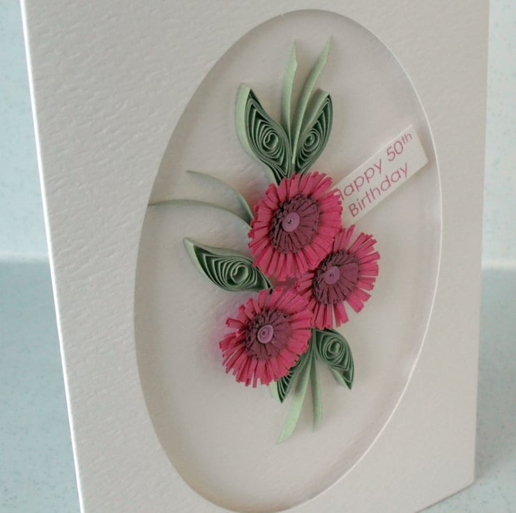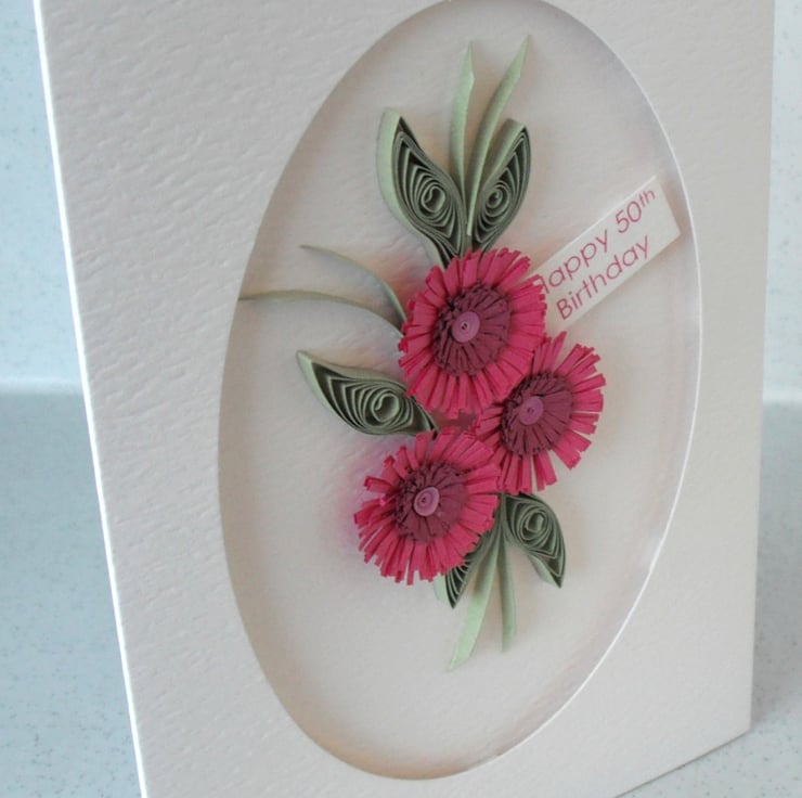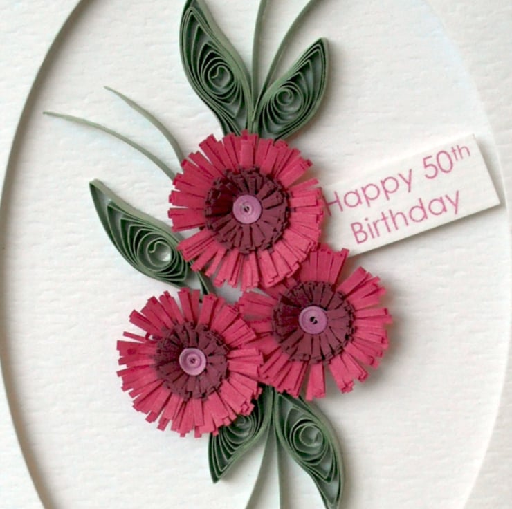 A beautiful quilled card with quilling flowers in coordinating shades of raspberry pink and burgundy for a very special person. Perfect for helping that someone special celebrate a momentous birthday.