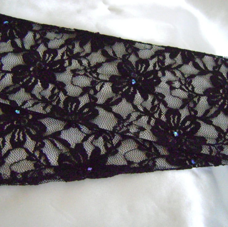 Beautifully seductive black lacy pair of gloves. Hand finished & beaded to twinkle with every gesture, approx 40.5cm / 16" from fingertip to cuff & fits one size. Vintage evening elegance at it's best!