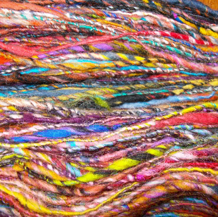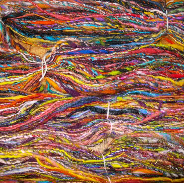 I have created this fantastic art yarn from a multitude of different colours and fibres. There is a mix of merino, lleyn and alpaca fibres, with silk threads added to the blend. Some of the fibres are the natural colour of the fleece, some have been home dyed and some are pre dyed.