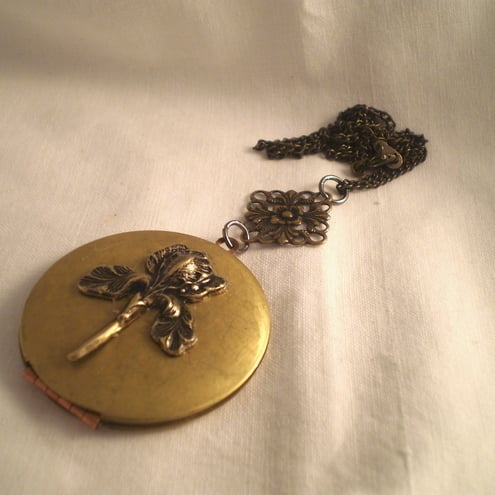 A vintage brass locket has been decorated with an ornate brass lotus flower stamping, with a delicate filigree connector.