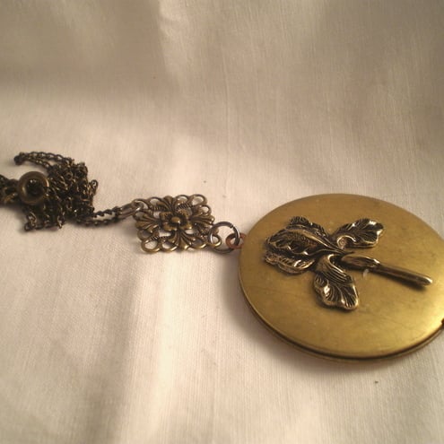 Hangs from and 18 inch brass chain.... locket measures 3 cms in dia.