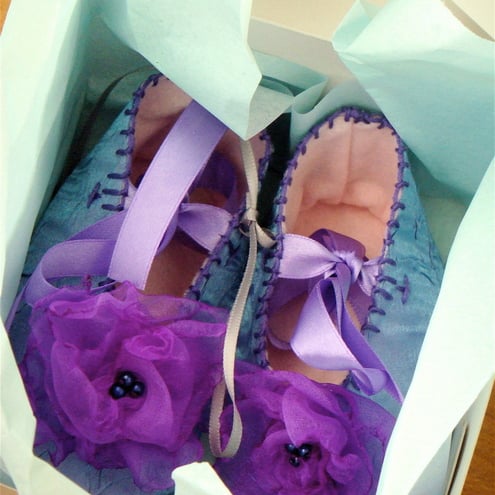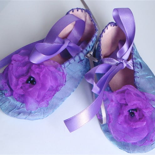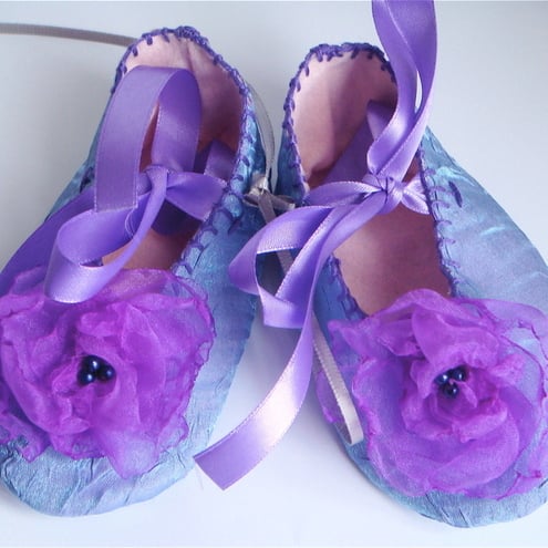 These are so cute, made from crushed satin and felt, they have purple tonic uppers and soles, they are lined in pink felt, and are decorated with 1 purple handmade organza flower with purple beads on each shoe, purple ribbon ties. the pattern for these shoes are for 3-6 mths, but they may fit an older baby, 11.5cm length and 5.5cm wide, inside measurements.