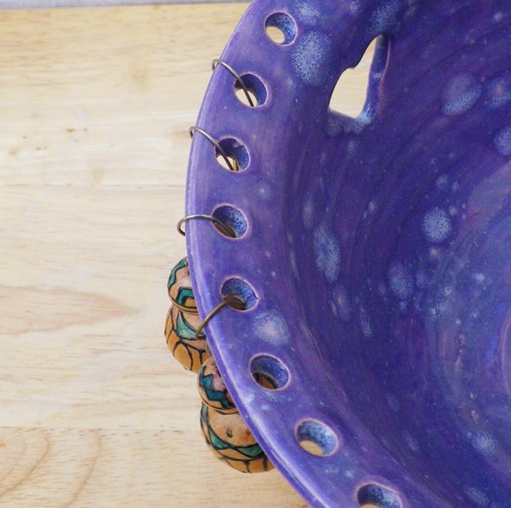 The bowl was thrown by me on my pottery wheel using strong white earthenware clay and the holes made whilst still damp.