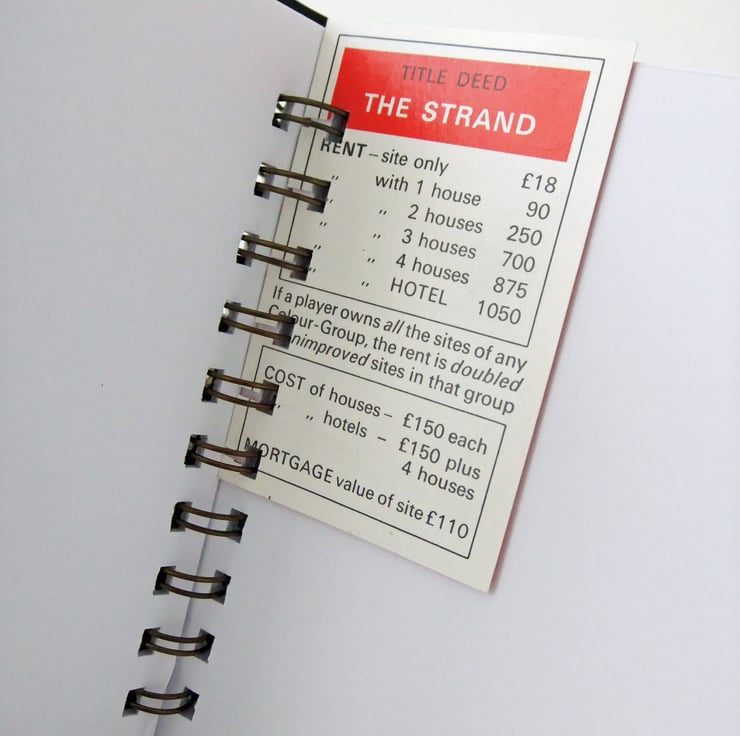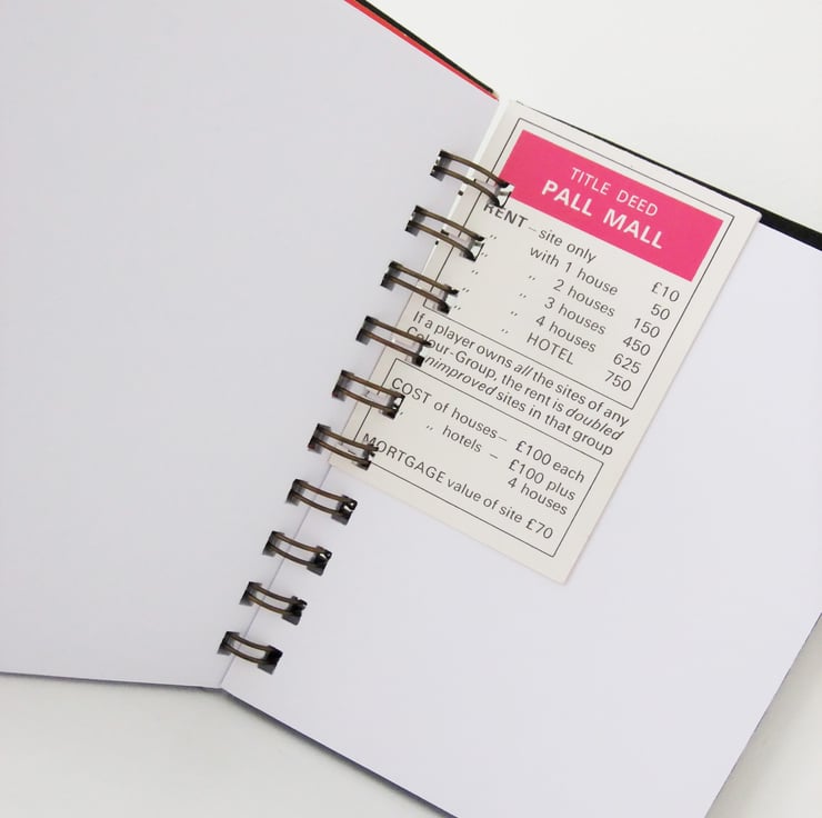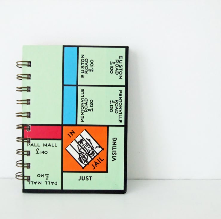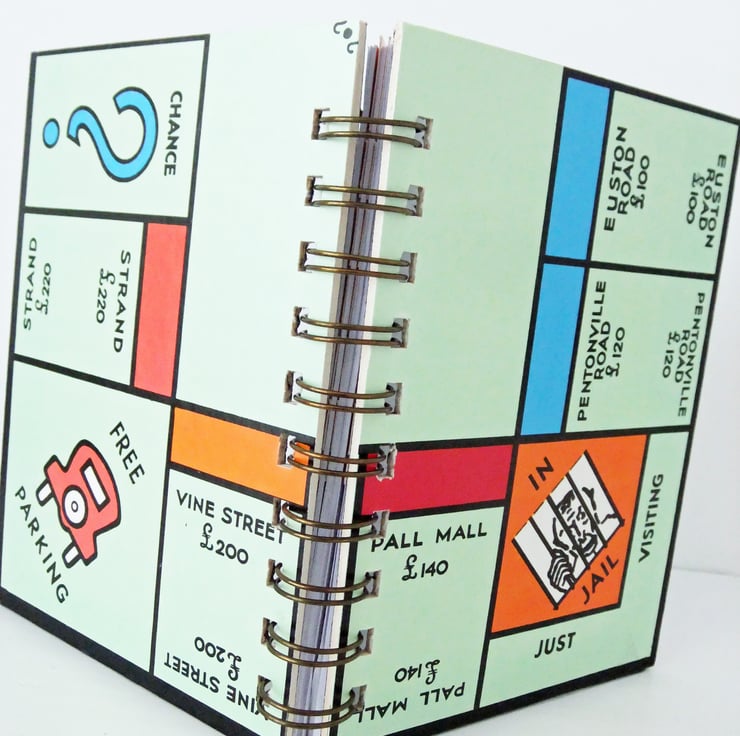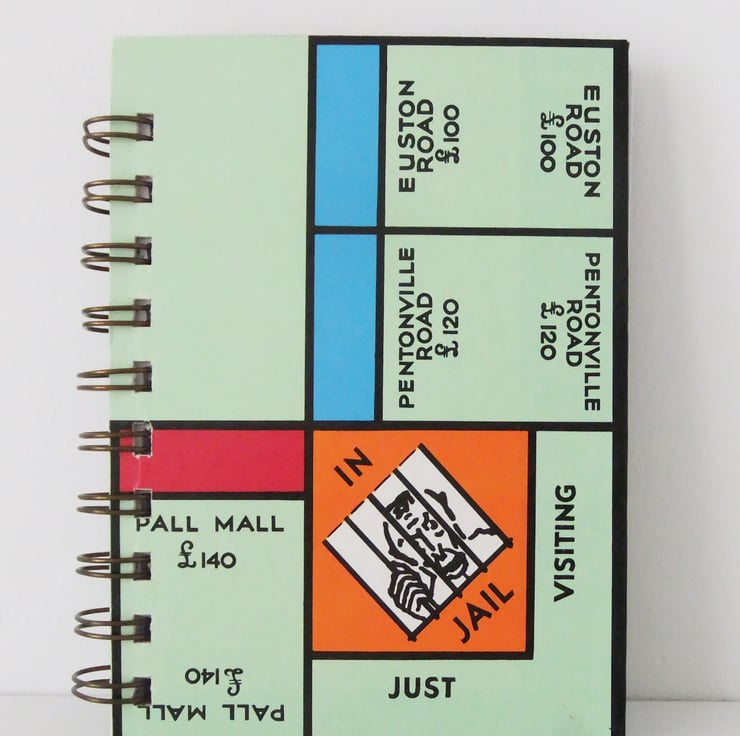 This is a great size of notebook for carrying in a bag or pocket. It has been made from a vintage Monopoly game. The covers are from the Monopoly game board and 3 of the property cards from the game have been used as moveable dividers inside the notebook.