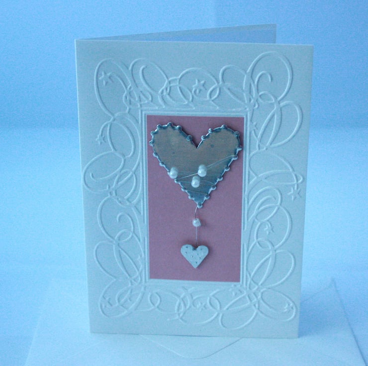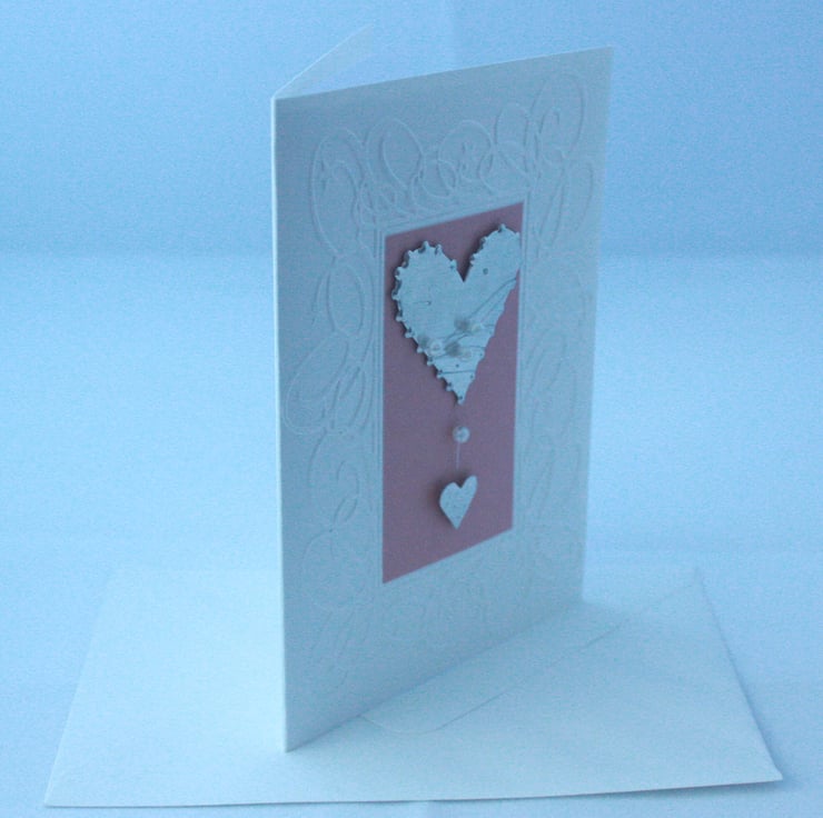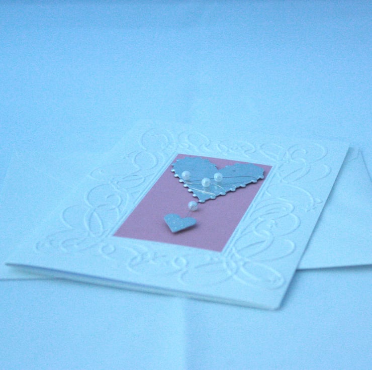 A6 card with embossed background, pink inset and metal/pearl heart embellishment, suitable for a number of occasions. The card comes with white envelope in a cellophane wrapper. Inside is left blank for your own message.