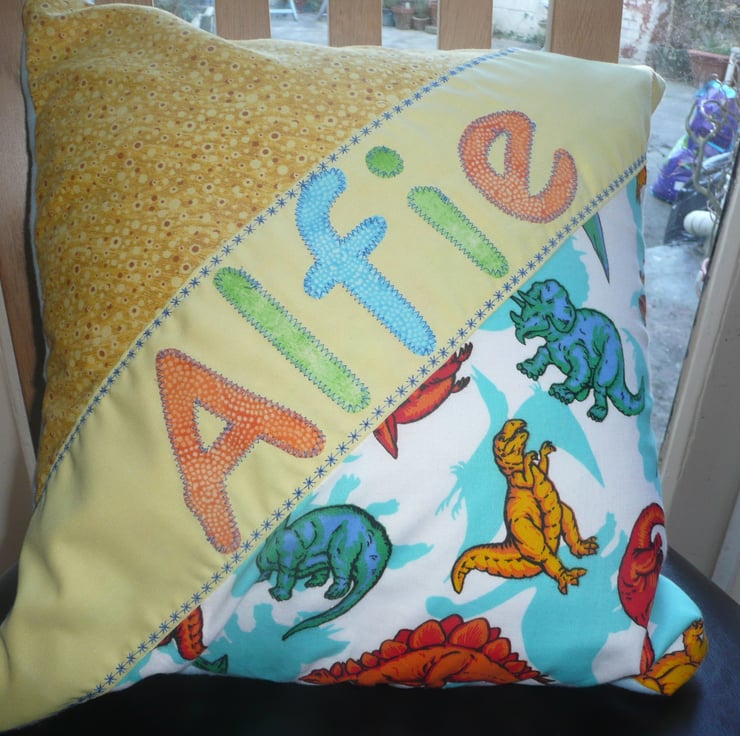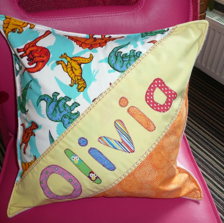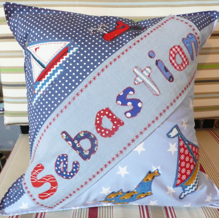A lovely addition to a nursery or bedroom. A cushion (approx. 16" / 40cms square) in colours of your choice. I use brand new polyester cushion inners, covers are made from a range of mostly cottons, some new and some recycled but all very fresh. Please contact me with your specifications when you order. I will use a variety of fabrics and your cushion will be totally unique, for this reason I can't guarantee a specific fabric but will do my very best to suit you.