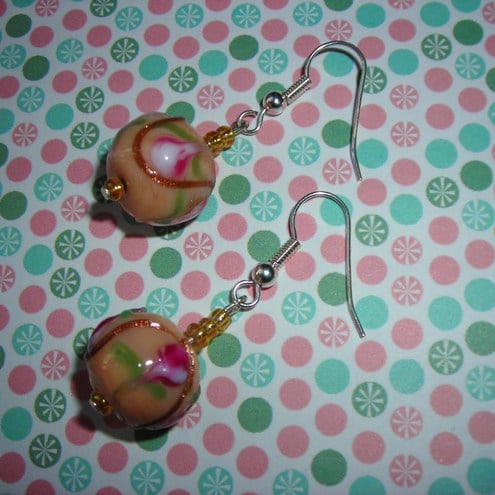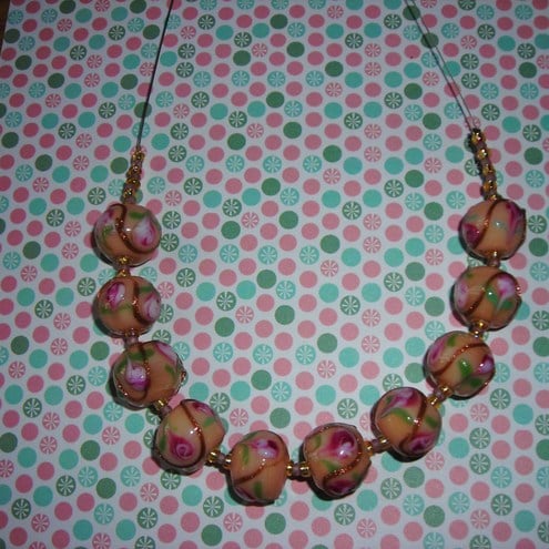 This lovely set is made from flower patterned beige glass beads, each flower bead is linked by tiny seed beads.