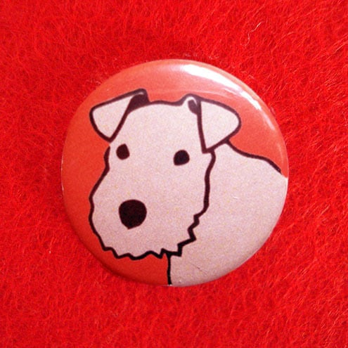 Cute Lakeland Terrier on a lovely shiny badge with a metal pin back.