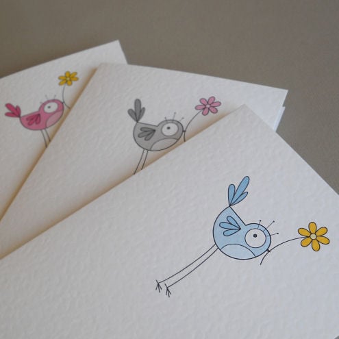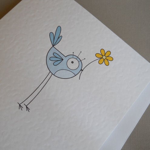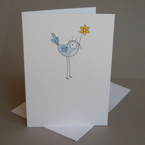 unique and quirky illustrated card featuring a cute blue bird. he is holding a bright yellow flower, just for you! could be used for any occasion: a thank you, a birthday, ...or maybe if you need to say sorry and make up!