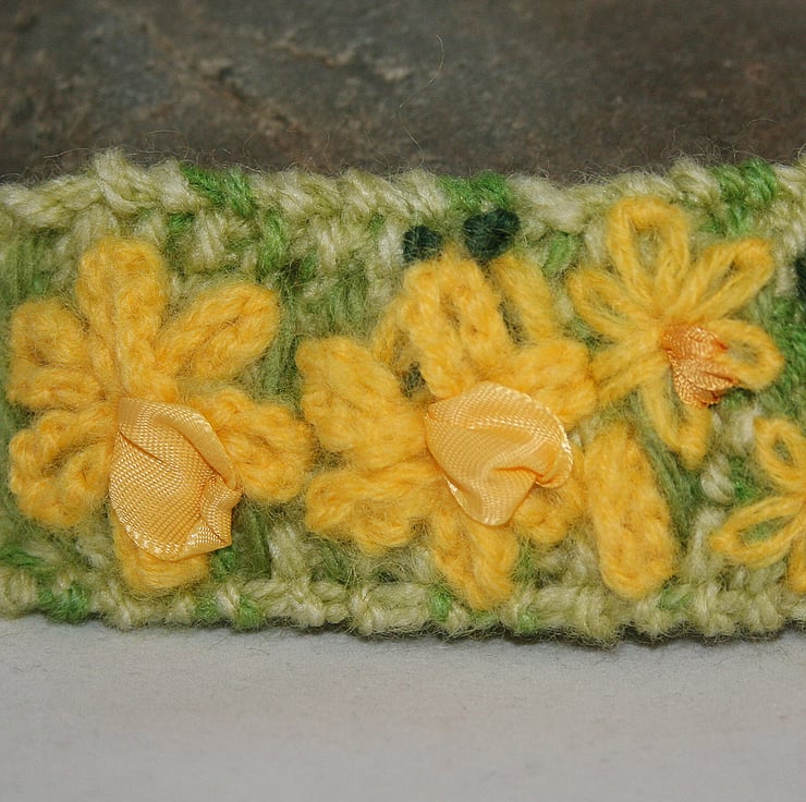 The background for this embroidery is hand knitted in a wool blend yarn which shades through several lovely greens. Moss stitch has been chosen to add texture to the design. The daffodils are embroidered in a merino blend yarn - those in the foreground are stitched in a crocheted cord and those in the background are stitched in the basic yarn to give perspective. The trumpets of the daffodils are stitched in ribbon - silk ribbon for the smaller flowers and a wider satin ribbon for the larger flowers. Leaves are stitched in merino and tapestry wools.