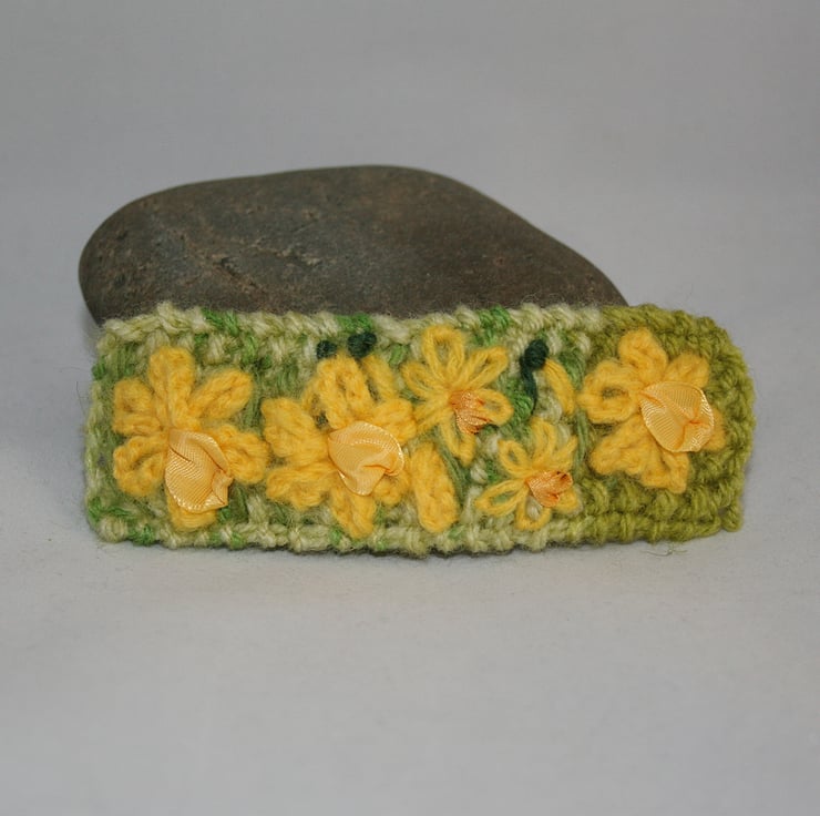 Beautiful daffodils are embroidered, in relief, onto this lovely hair barrette or hair slide. A lovely Easter or Mothers' Day gift perhaps?