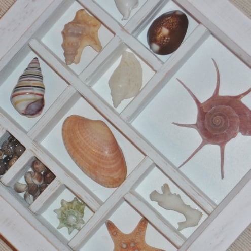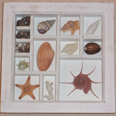 These lovely natural shells are arranged beautifully in a distressed wooden white frame.