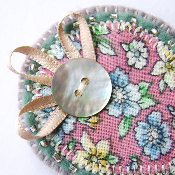 It is finished with a pretty ribbon and shell button detail and has a brooch backing for easy attachment.