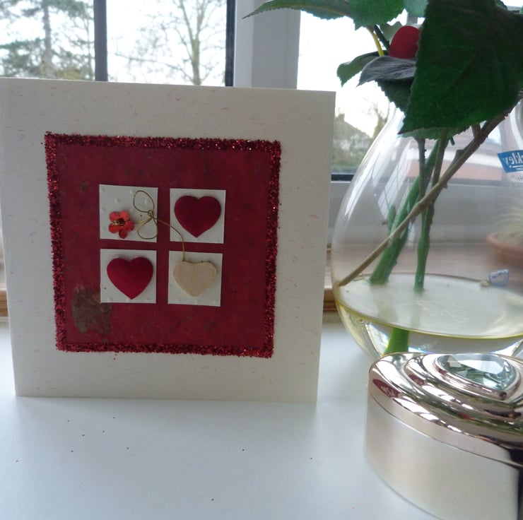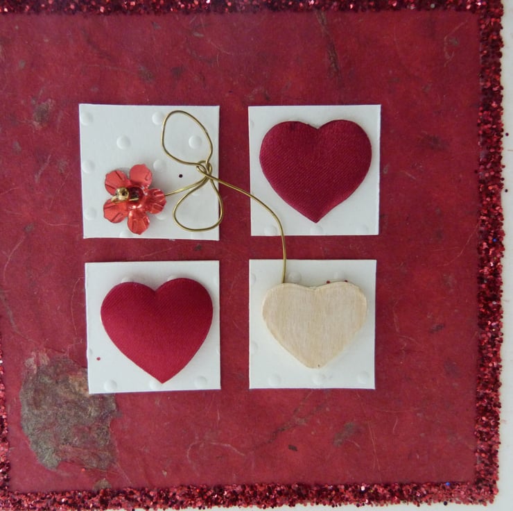 Two red fabric hearts, one natural wooden heart and red wire flower mounted onto 4 squares of dotty card and again mounted on red handmade paper which has all been mounted on cream/red fleck card and surrounded by romantic red glitter.