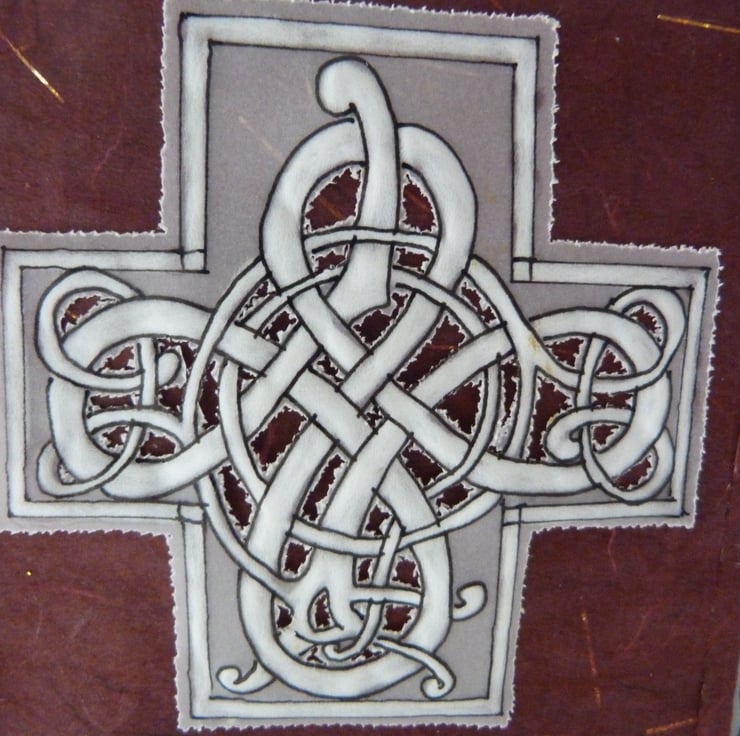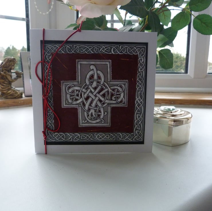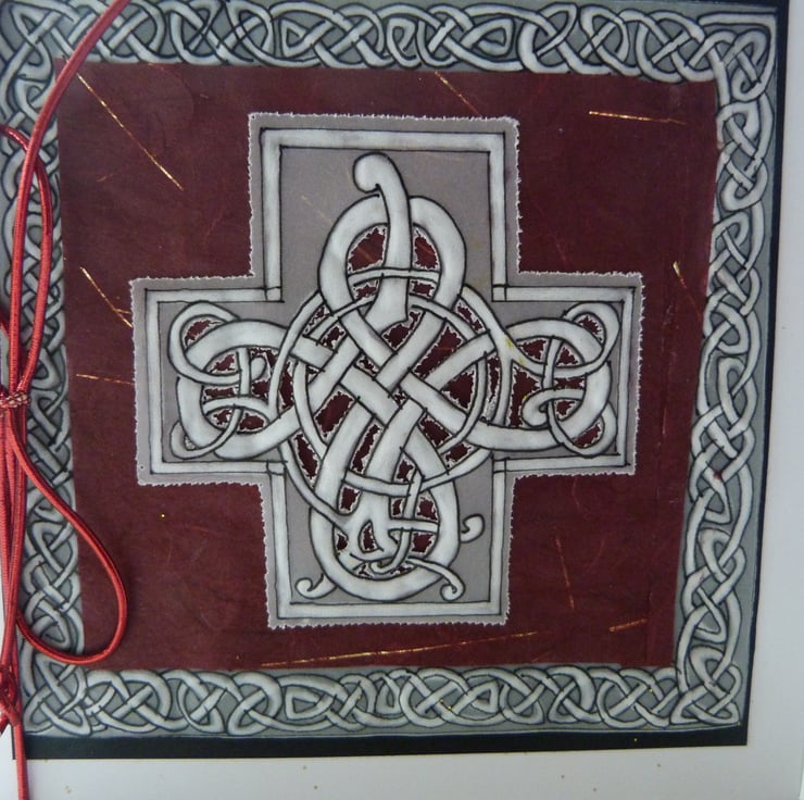 A beautiful traditional Celtic Cross embossed and perforated onto parchment. Mounted onto maroon handmade paper and bordered by further Celtic design of rope twist. Mounted onto black card and again mounted onto white card. Embellished with red rope cord bow.