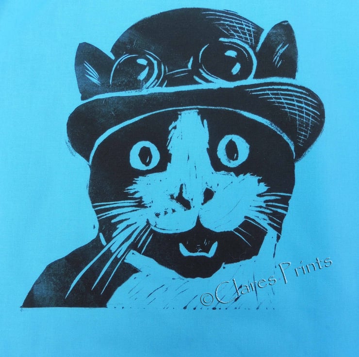 Steampunk Cat hand printed turqiose blue 100% cotton short handled tote bag.