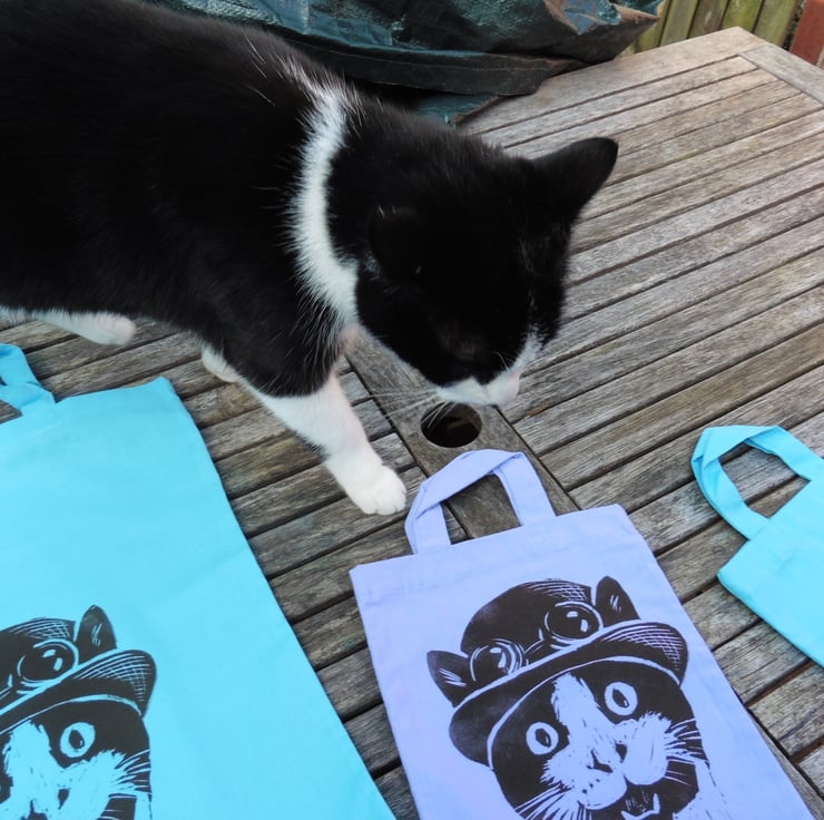 Steampunk Cat Tote Bag Animal Linocut Hand Printed Blue Shopping Bag
