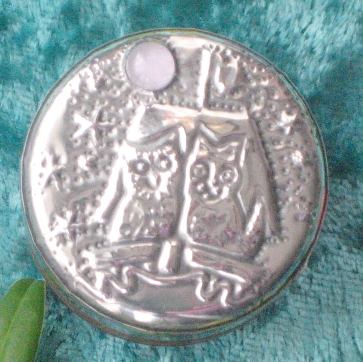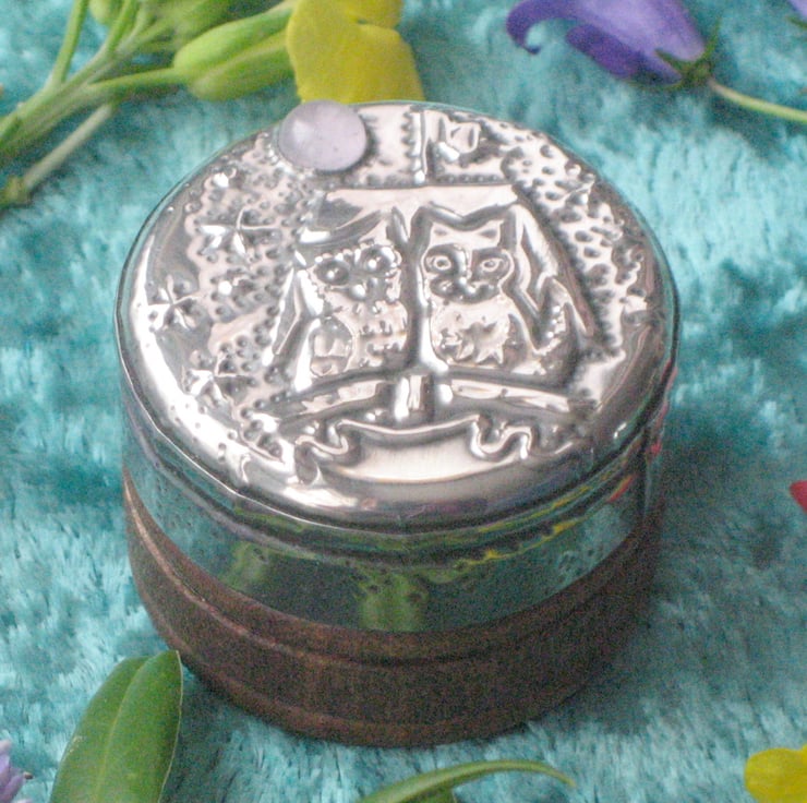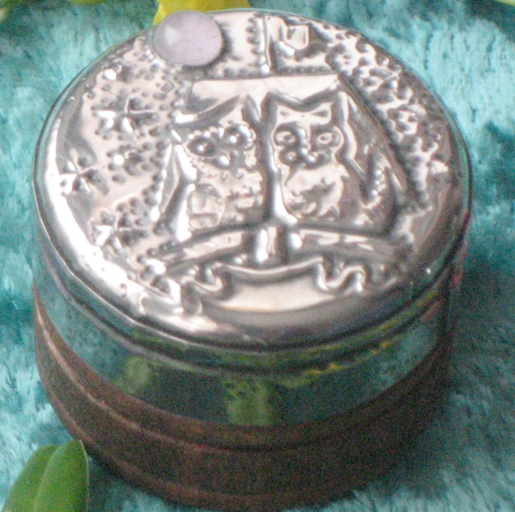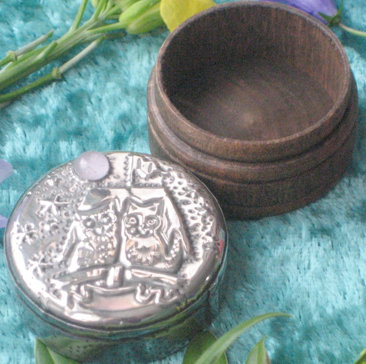 This little rustic wooden box has been transformed with a lid of hand-crafted pewter. The romantic duo sail beneath a moon of rose quartzl. The box measures 39mm (1.5ins) across and is 30mm(1.25ins) high.