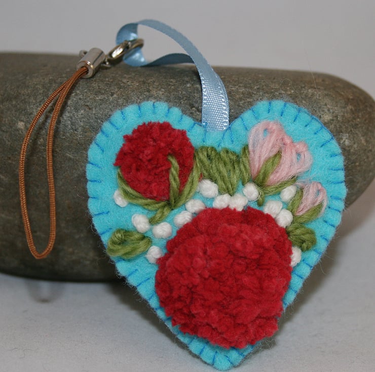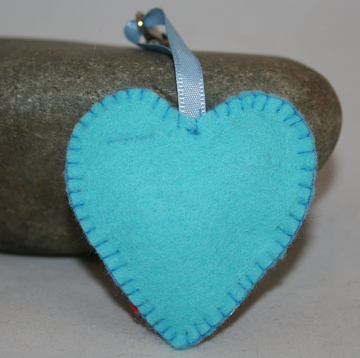 The back of the brooch is neatened with a second heart in turquoise felt and a charm cord is fastened through a ribbon loop.